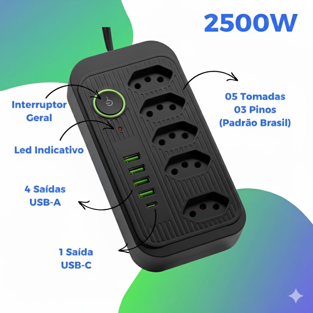 Filtro de Linha 5 Tomadas, Extensão, Régua de Energia Elétrica, Cabo 2 Metros, 4 USB A e 1 USB-C, BiVolt 110-220V, Potência de 2500W...
